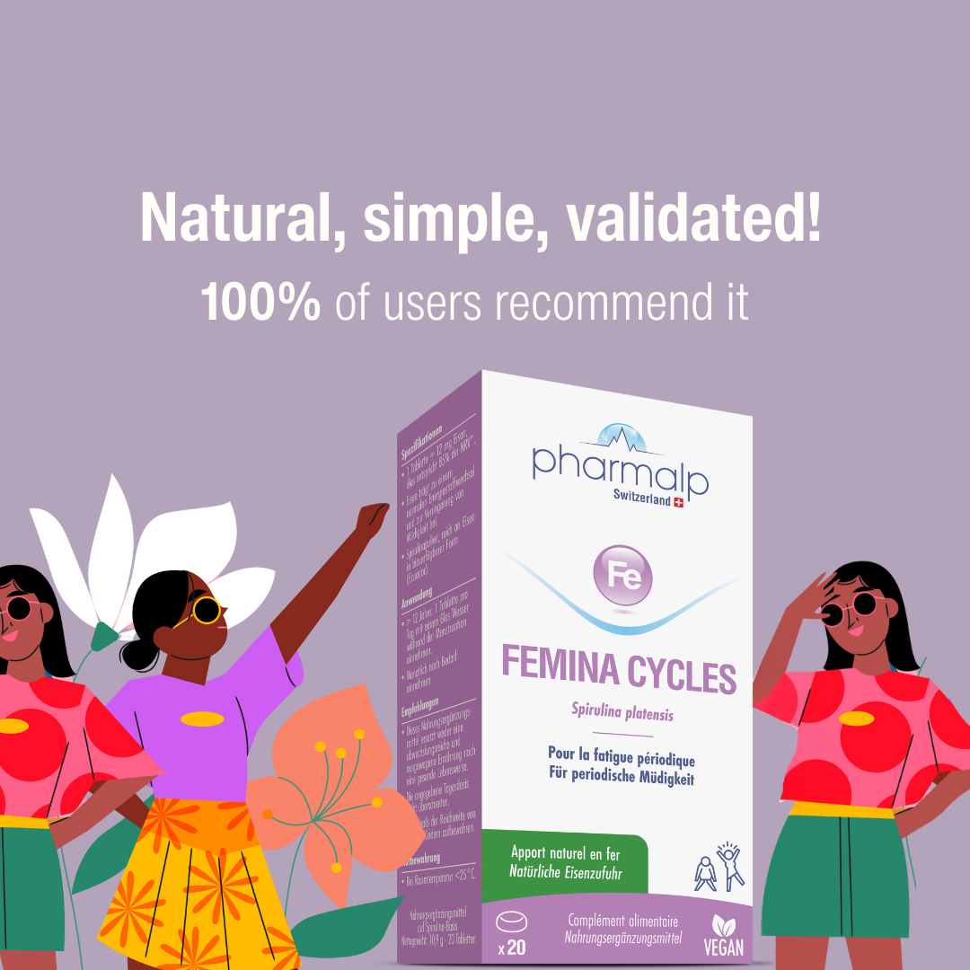 If you’re feeling fatigued during this period and your periods are frequent or heavy, we recommend long-term daily supplementation. In this case, SPIRUL-1®, which provides the same amount of iron as FEMINA CYCLES but comes in packaging suitable for continuous use, can help ensure regular iron intake and reduce the sometimes intense fatigue associated with these phases.