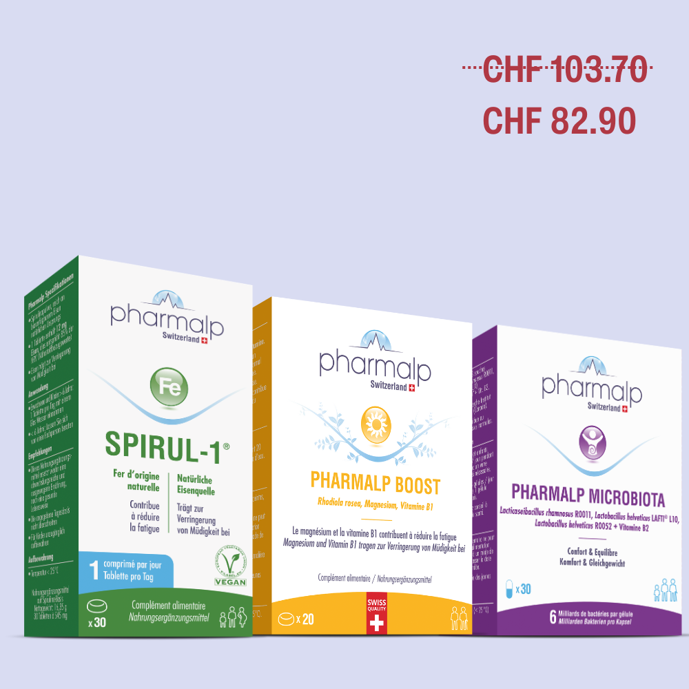 • En préparation (10 jours avant la compétition ou pendant une phase d’entraînement intensif) : prenez chaque jour  1 comprimé de PHARMALP MICROBIOTASPIRUL-1® et de  PHARMALP BOOST pour renforcer votre flore intestinale, optimiser votre apport en fer biodisponible et soutenir votre vitalité mentale et physique.